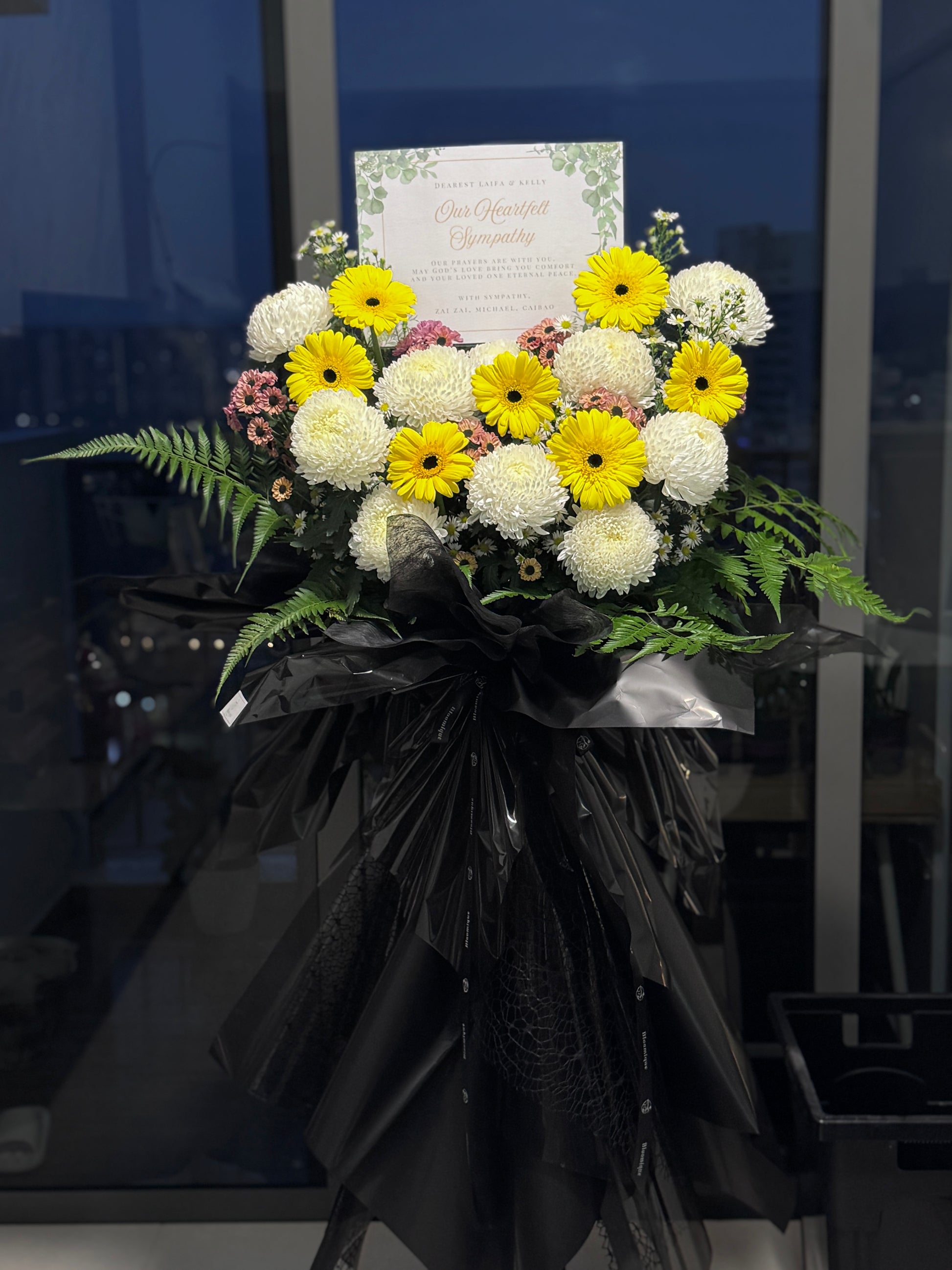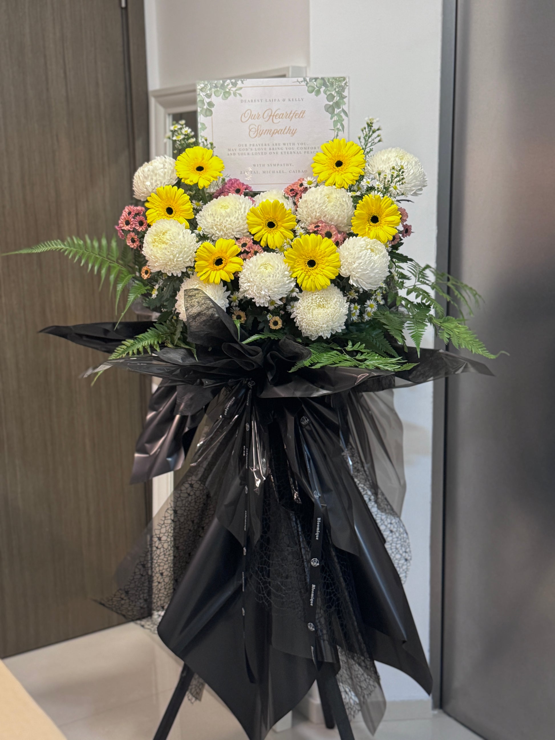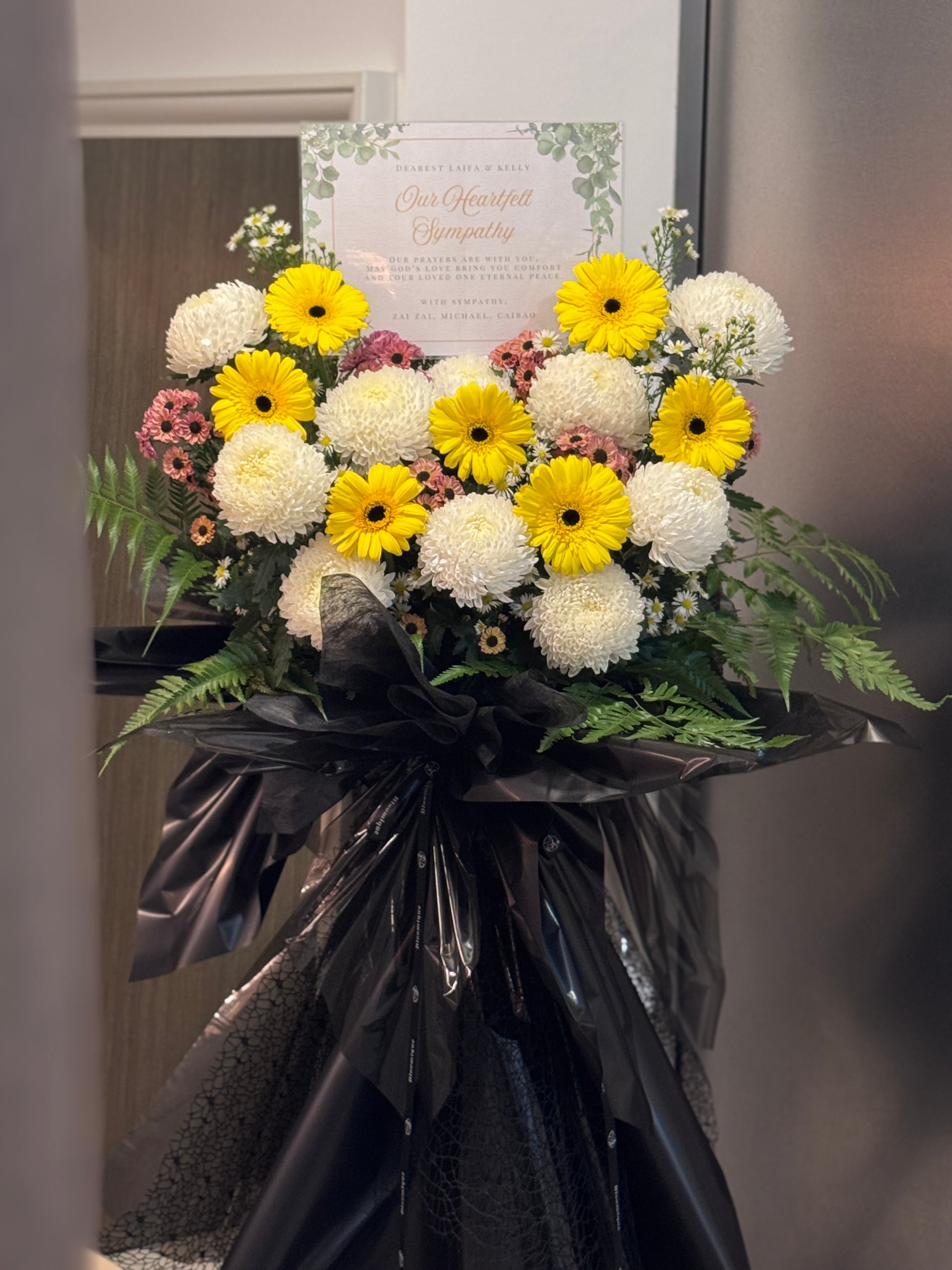Thoughtfully arranged with pristine white chrysanthemums, cheerful yellow gerberas, soft pink asters and lush fillers, this arrangement symbolizes remembrance, hope, and eternal peace. Accented with lush greenery and elegantly wrapped in black, it conveys deep respect and solace during times of loss.