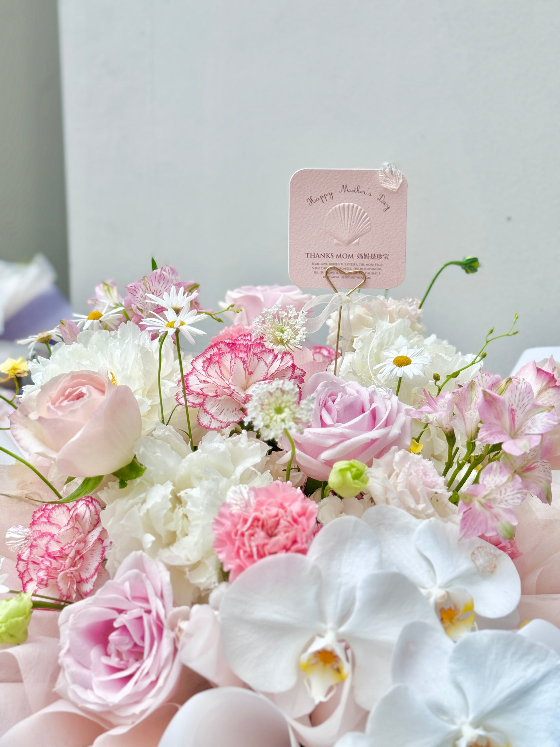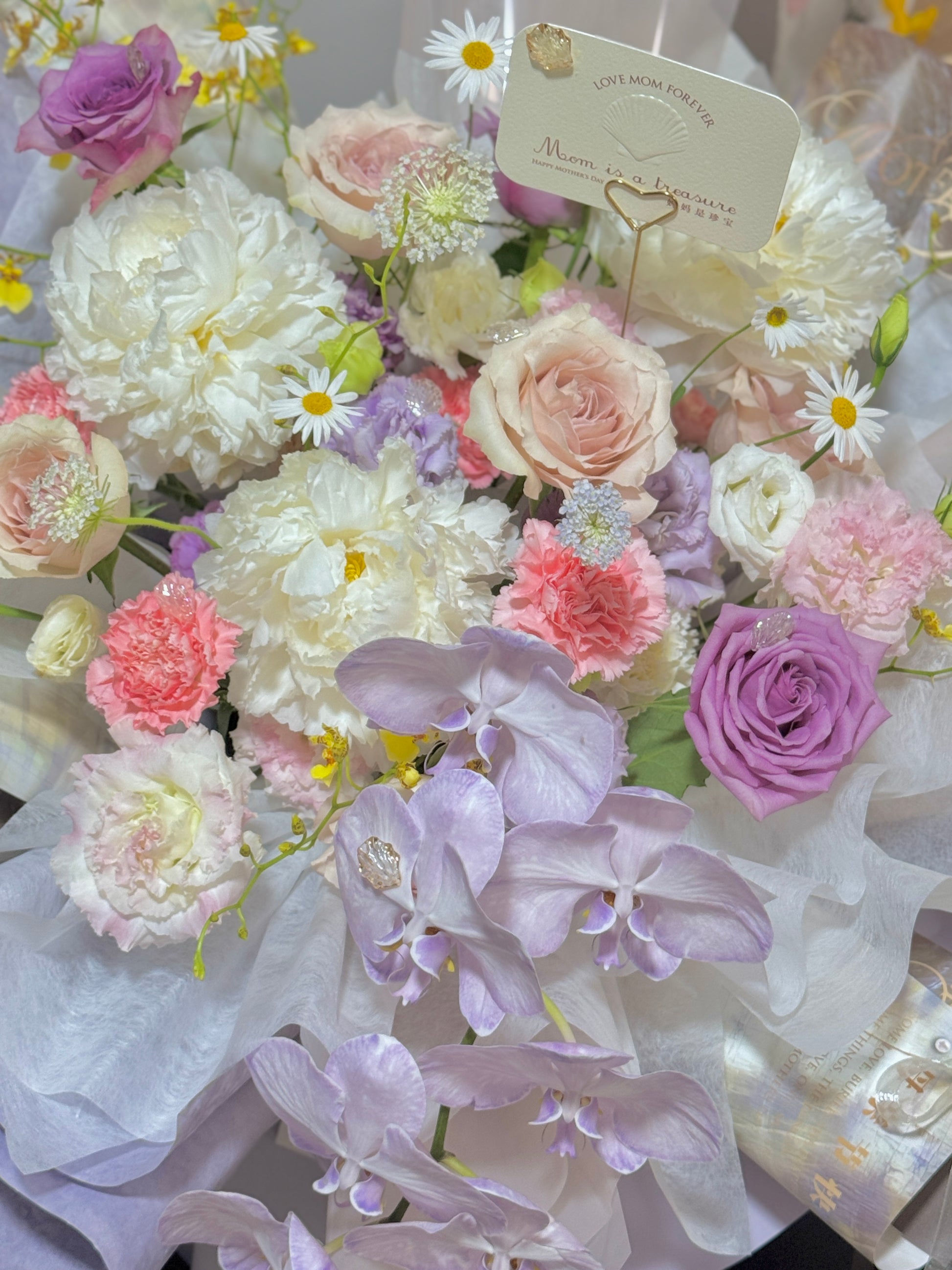 Eternal Treasure is a grand, hug-shaped floral bouquet designed to honor the precious love of mothers. This luxurious arrangement features a mixed selection of elegant flowers, including seasonal peonies, phalaenopsis orchids, roses, carnations, dancing orchids, lisianthus and others playful fillers, set on a floral foam base to ensure freshness.