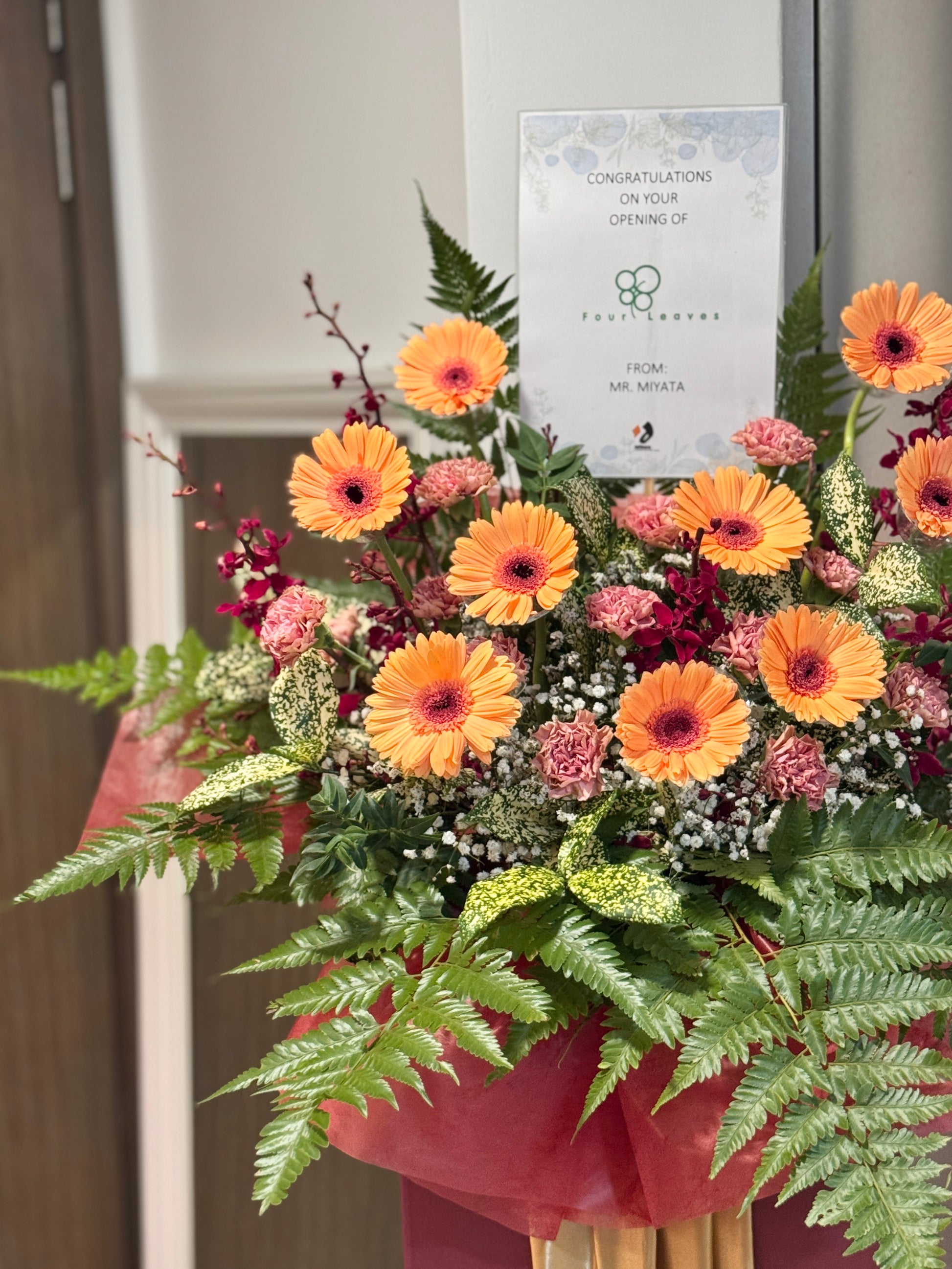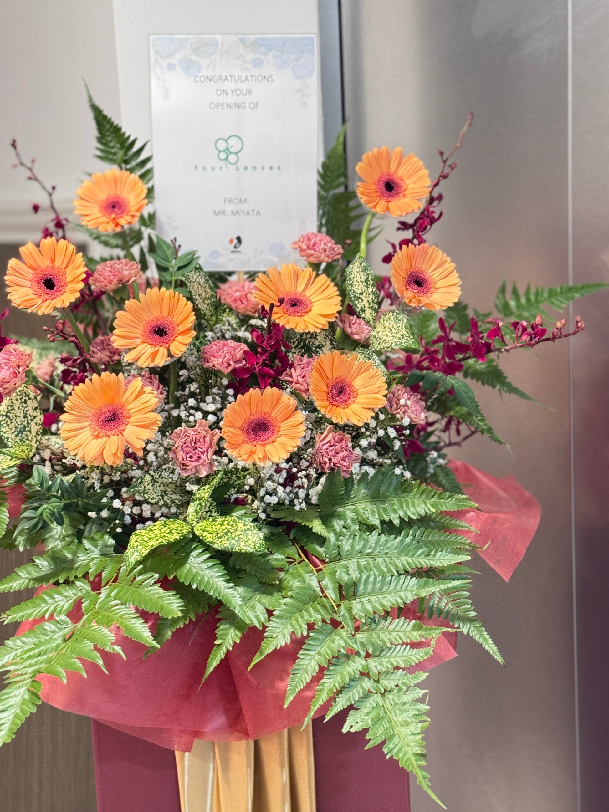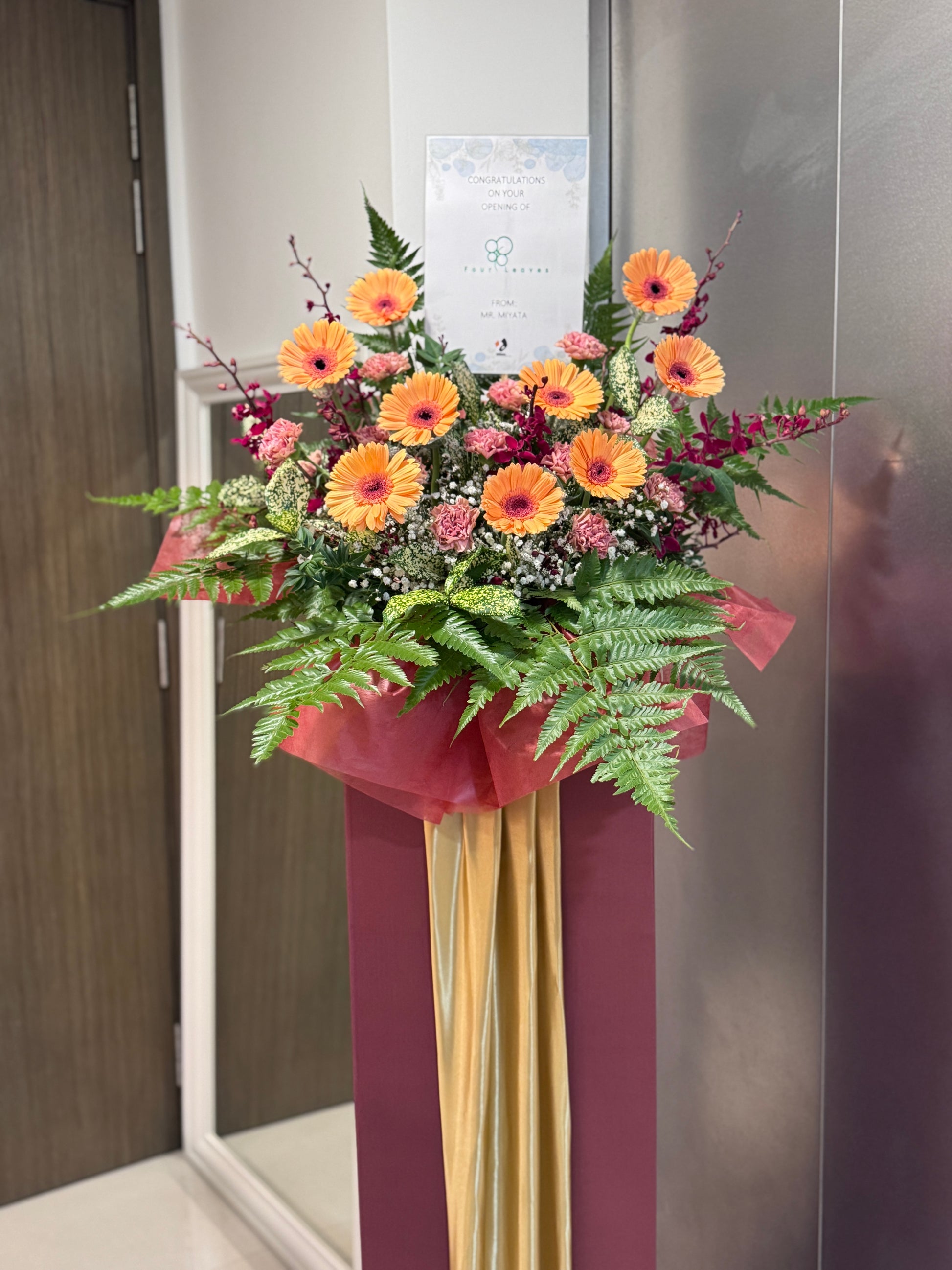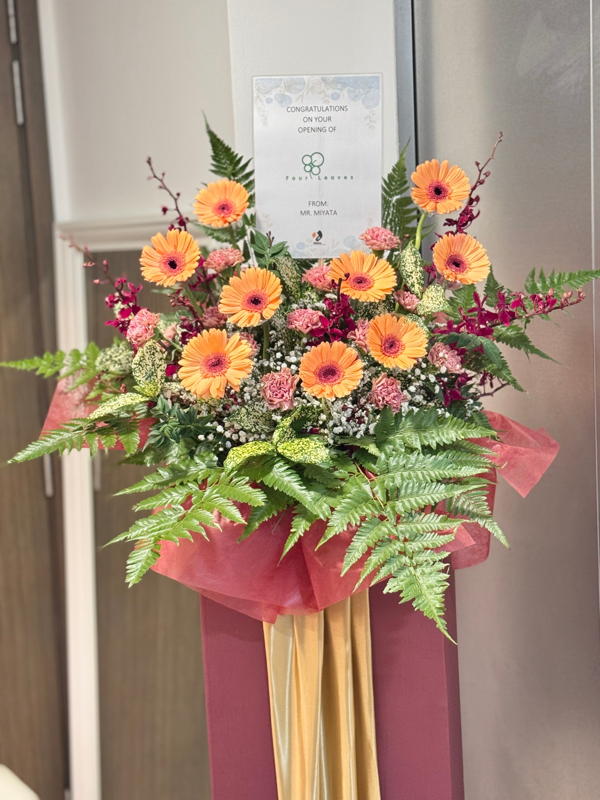 An uplifting arrangement bursting with warmth and positivity, wishing you a future as bright and full of success as these vibrant blooms. Featuring gerberas, elegant carnations, and lush fillers, this floral stand radiates abundance and joyful blessings.
