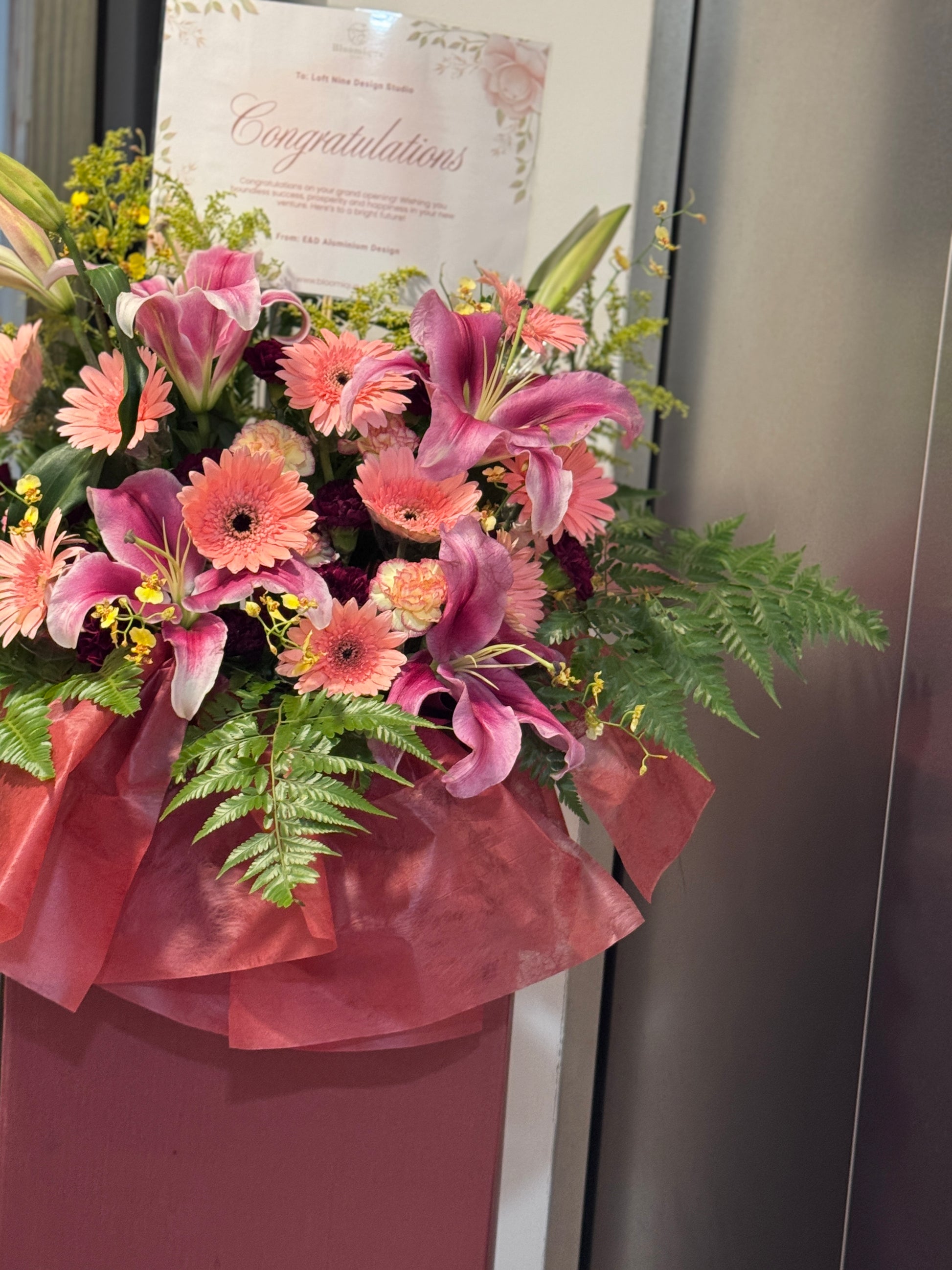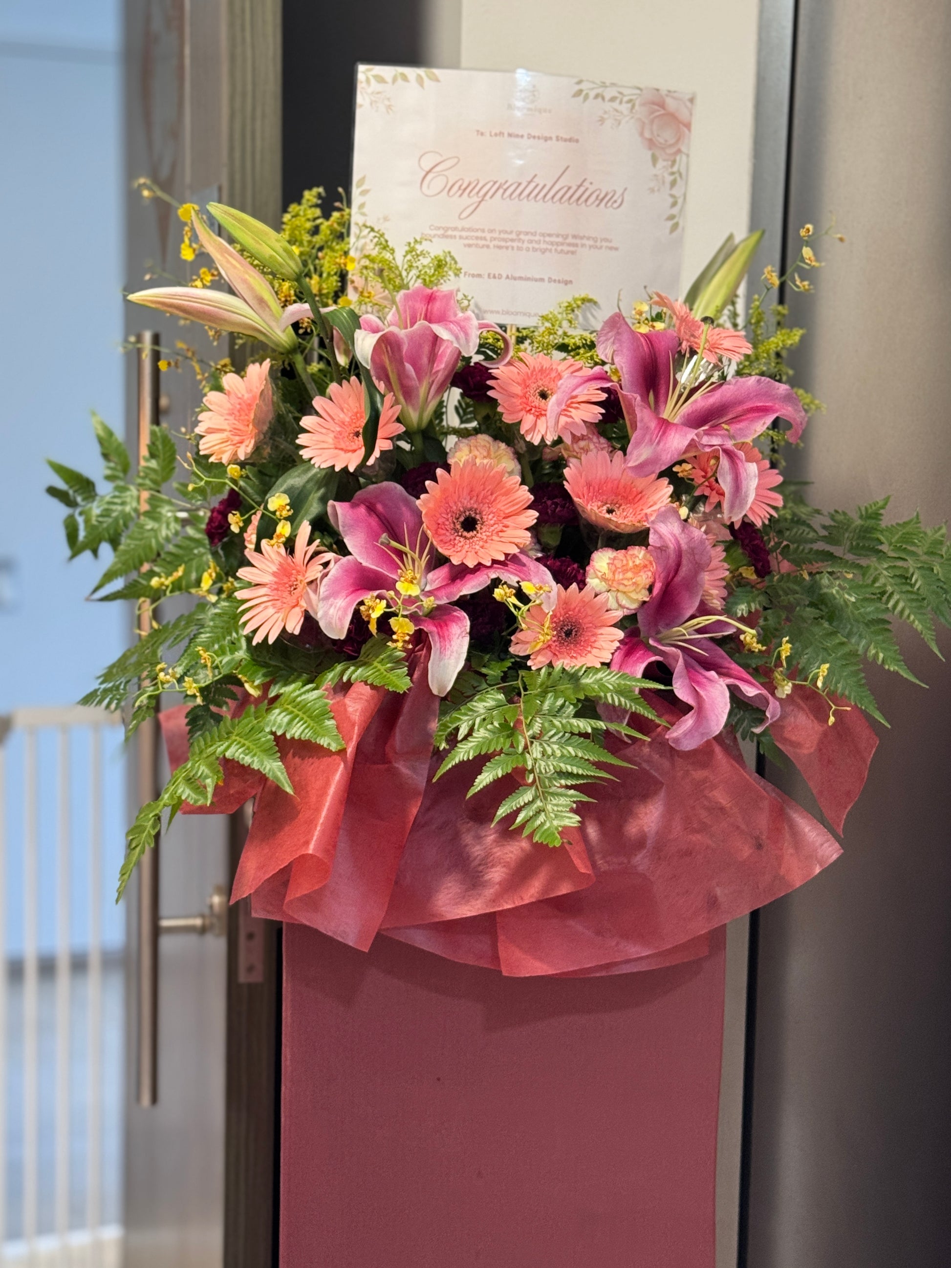 Celebrate new beginnings with a burst of prosperity and joy. Featuring pink lilies, elegant carnations, gerberas and lush fillers, this arrangement symbolizes abundant blessings, endless success, and a future as bright as your dreams.