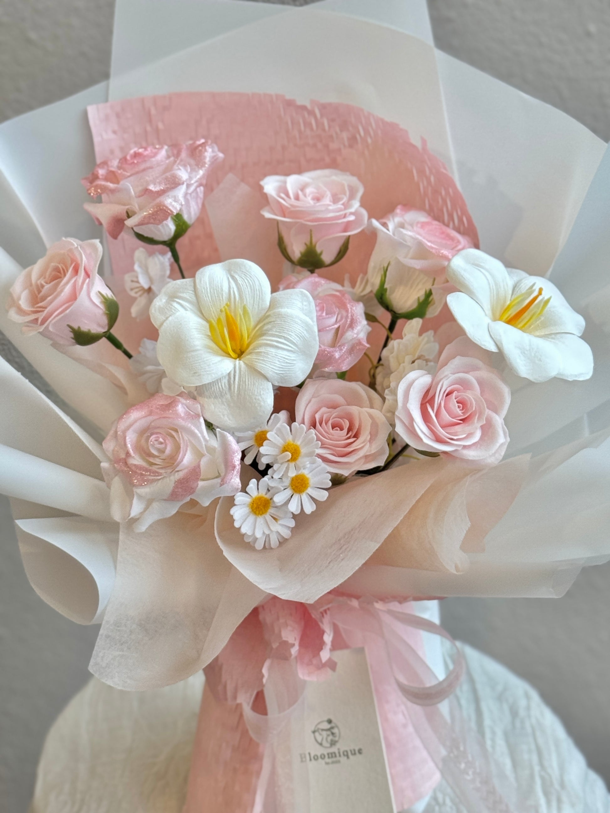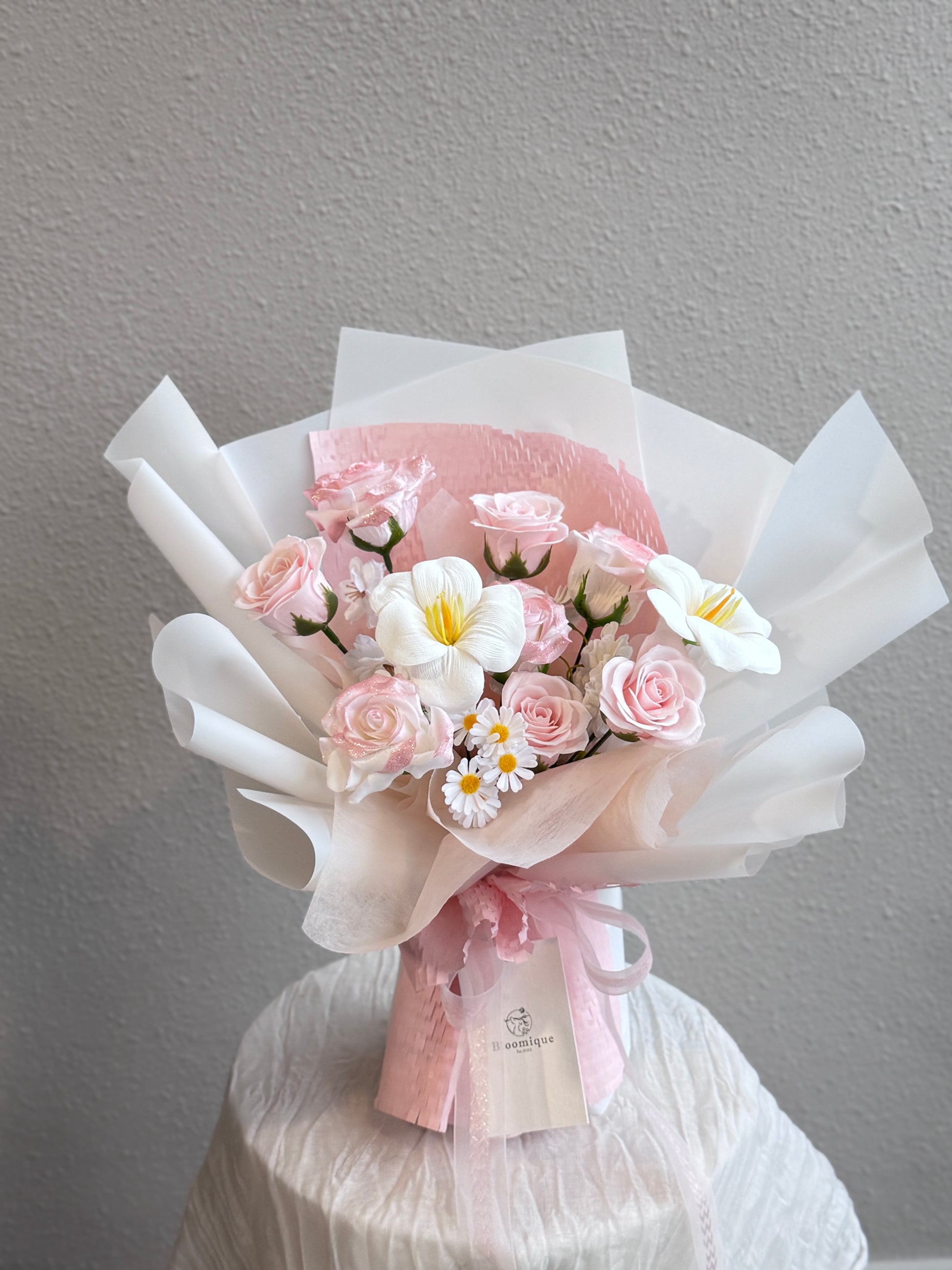 A soft and graceful soap flower bouquet featuring pink roses, elegant white tulips, sakura white and delicate daisies. Blending gentle romance with pure charm, this bouquet symbolizes sweet affection, innocence, and heartfelt blessings — the perfect way to brighten someone’s day and express your tender love.
