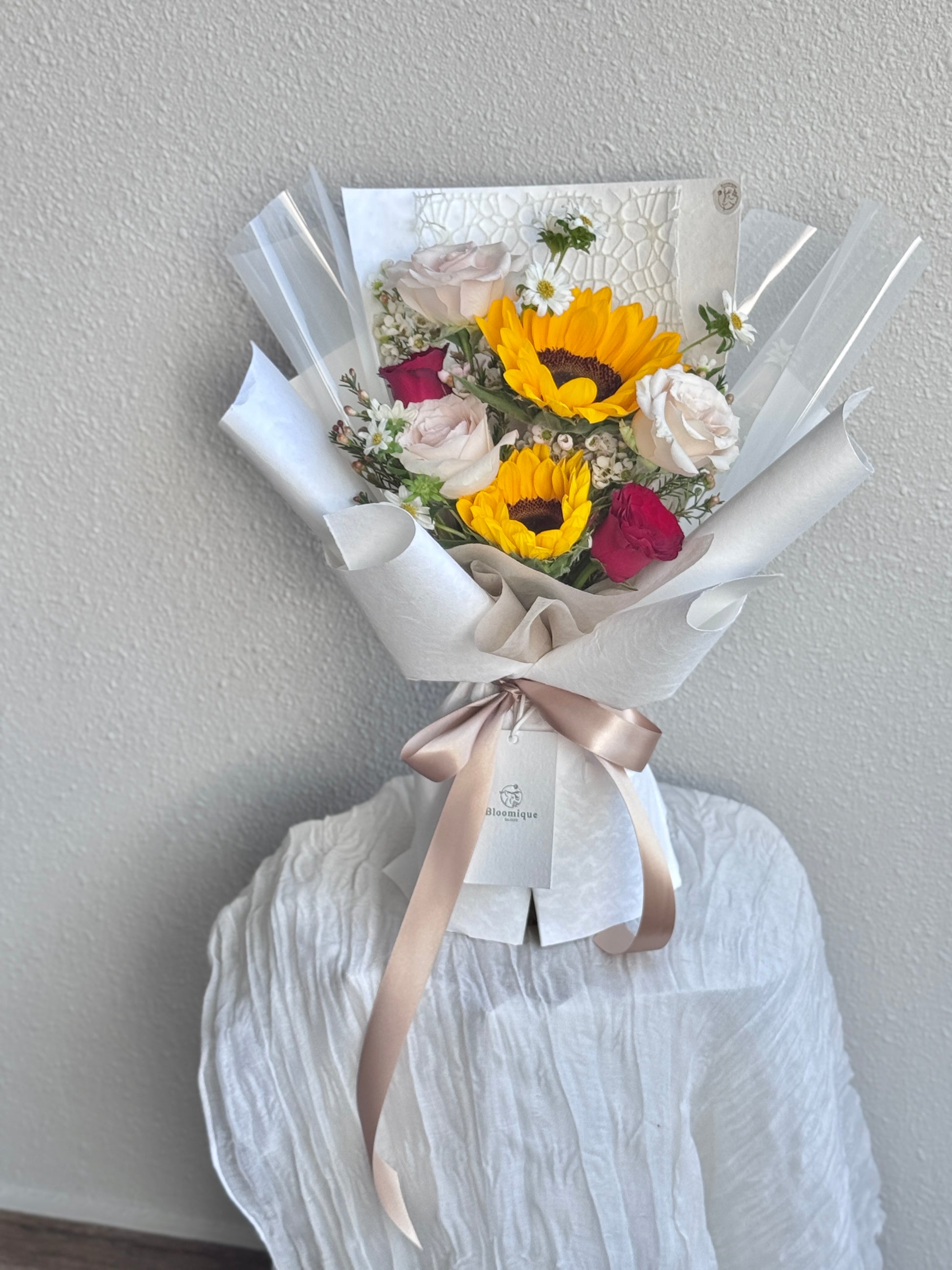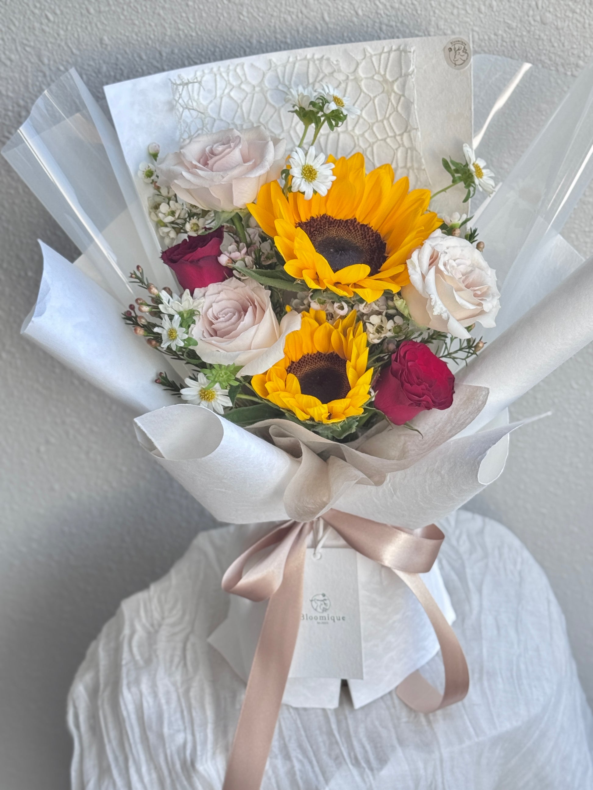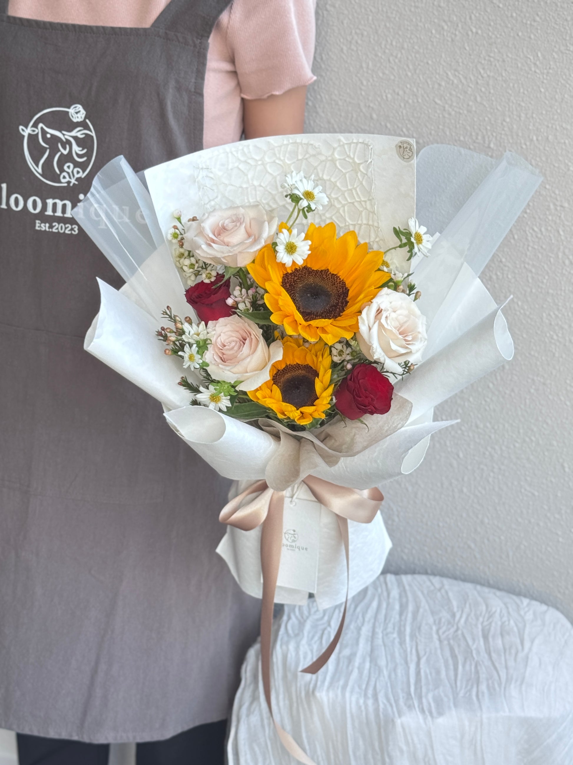 A radiant bouquet that captures both warmth and romance. Featuring cheerful sunflowers, tender pink roses, and passionate red roses, complemented with delicate daisies and filler flowers.