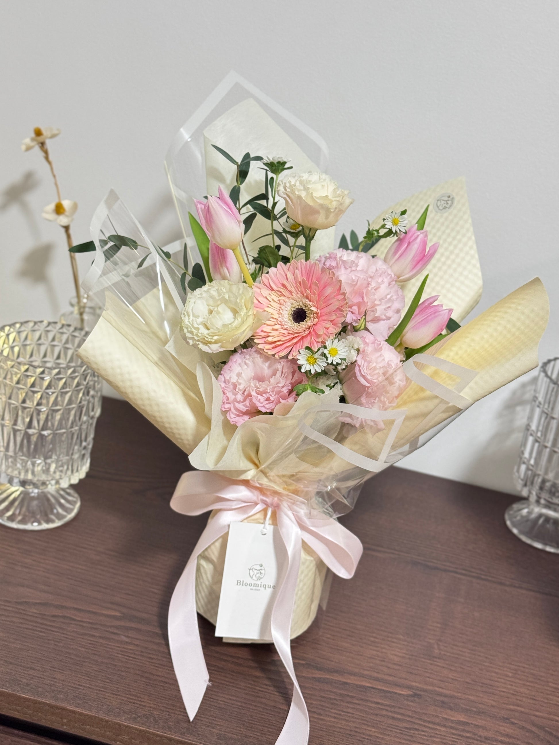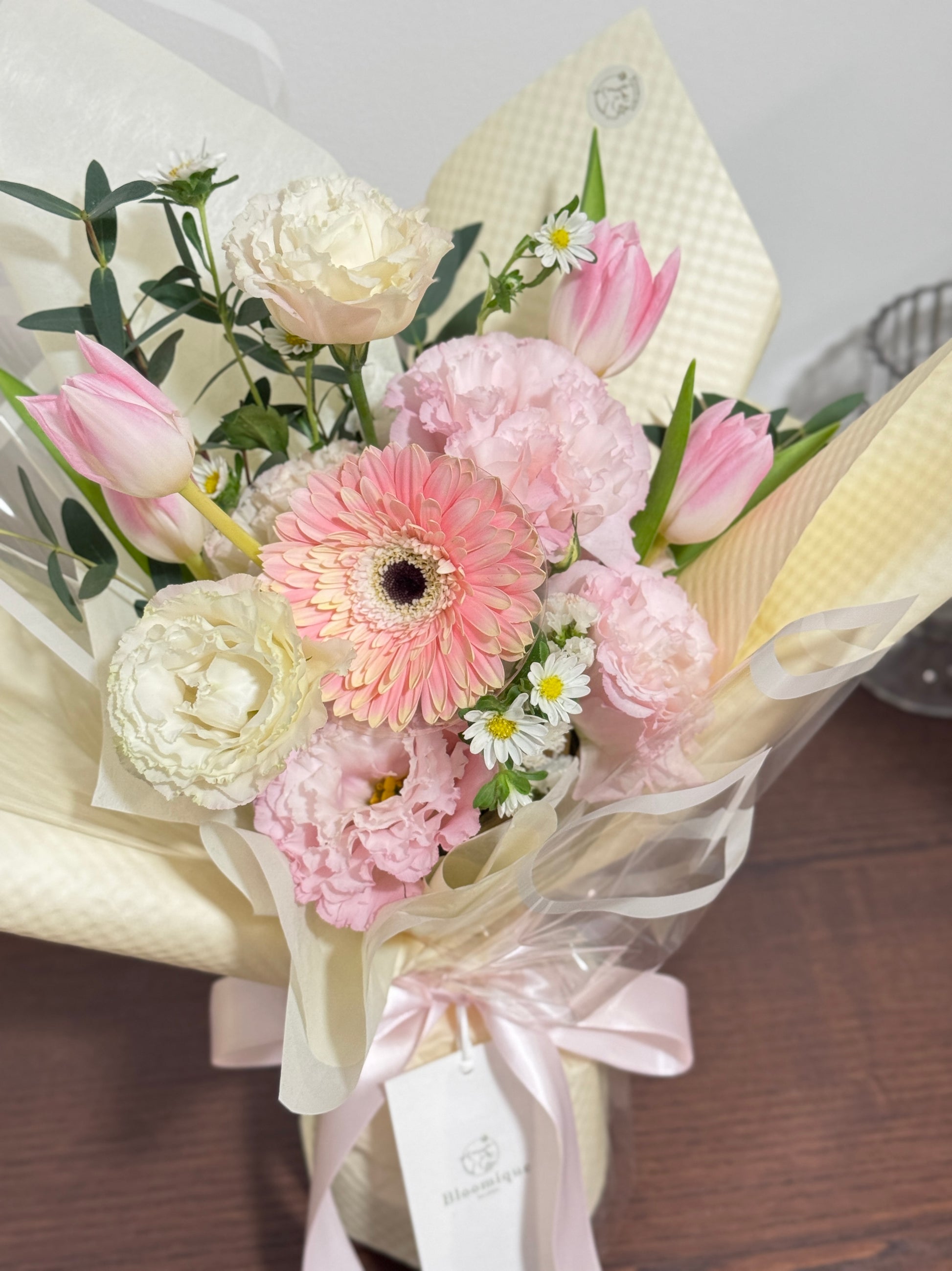 A delicate bouquet that celebrates softness and grace, featuring the cheerful charm of pink gerberas, the dreamy tones of pink lisianthus, and the refined beauty of white ranunculus. Pink tulips bring a gentle touch of romance, while white daisies add freshness and brightness. Finished with lush greenery,