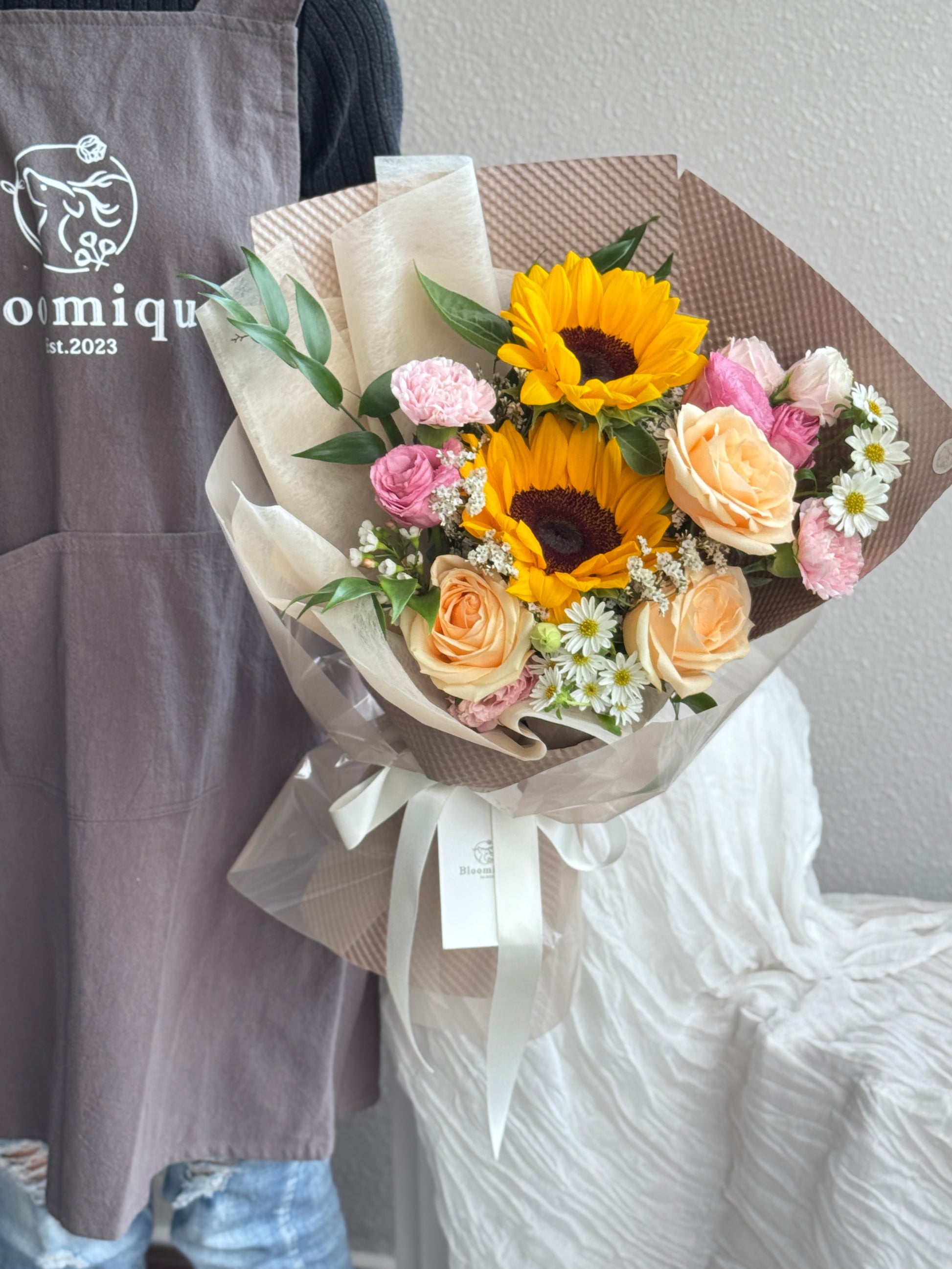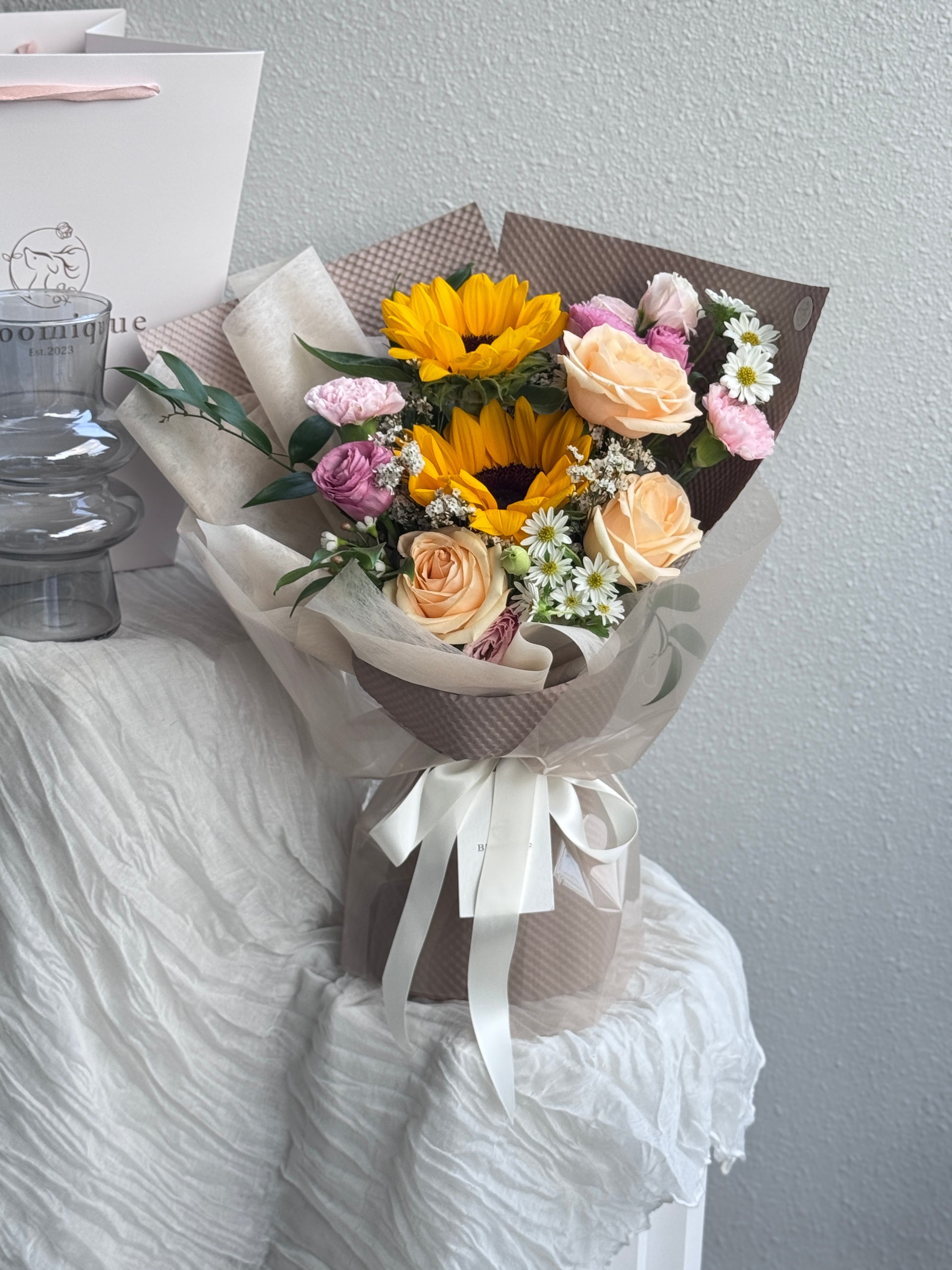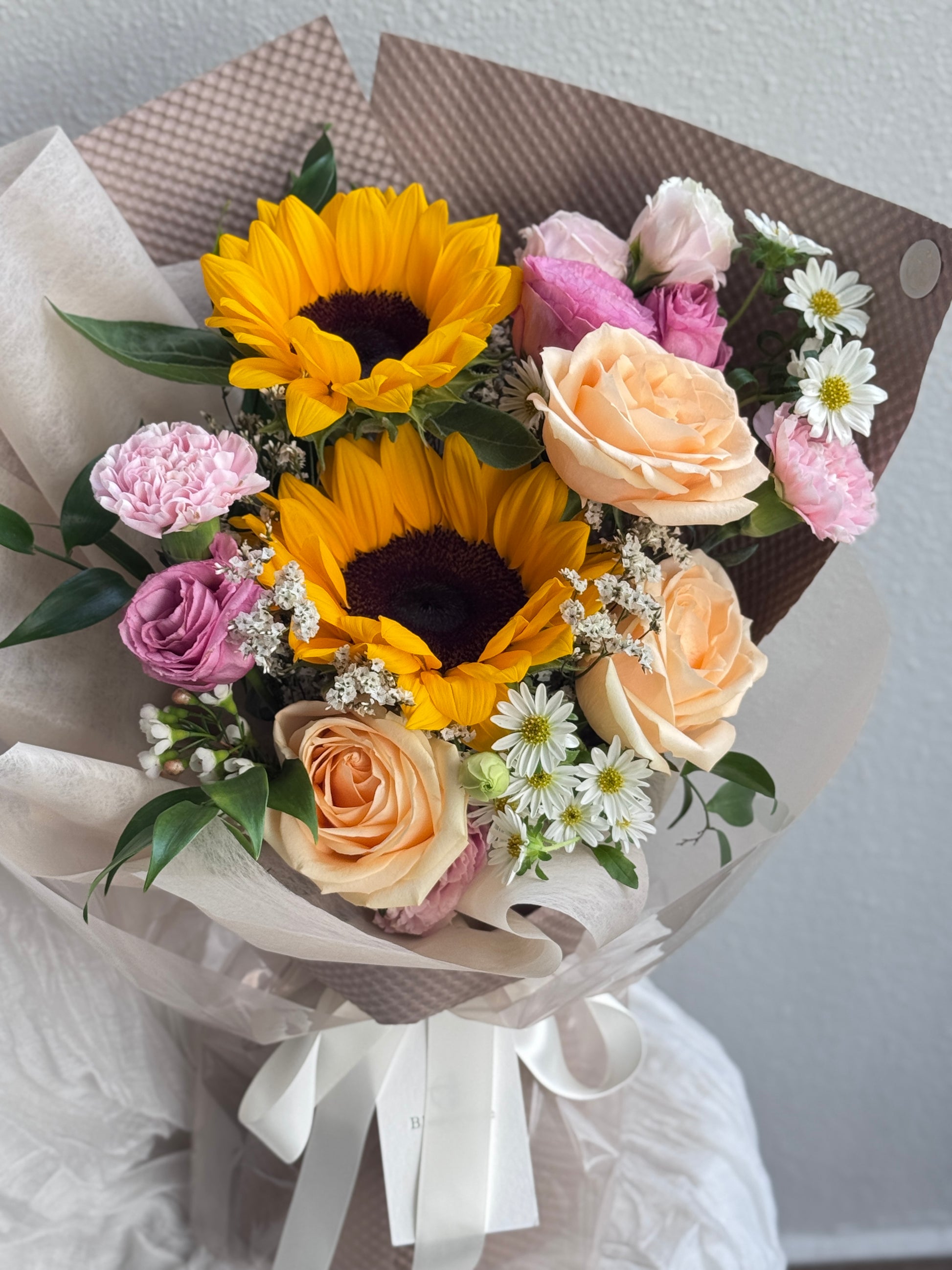 A cheerful and heartwarming bouquet featuring a radiant sunflower at its center, paired with elegant champagne roses, delicate eustoma, soft carnations, and charming daisies. Accented with filler flowers and lush greenery.