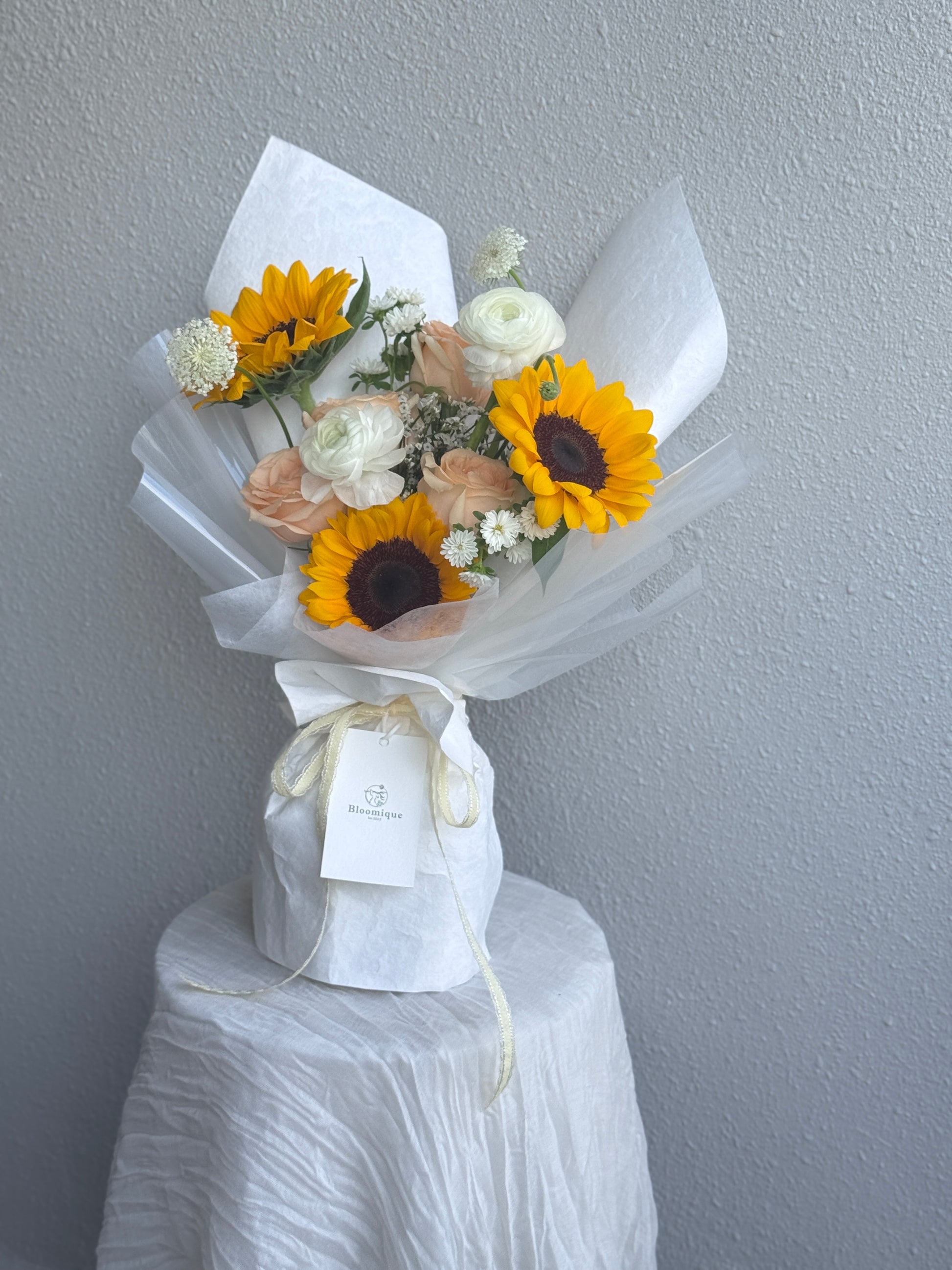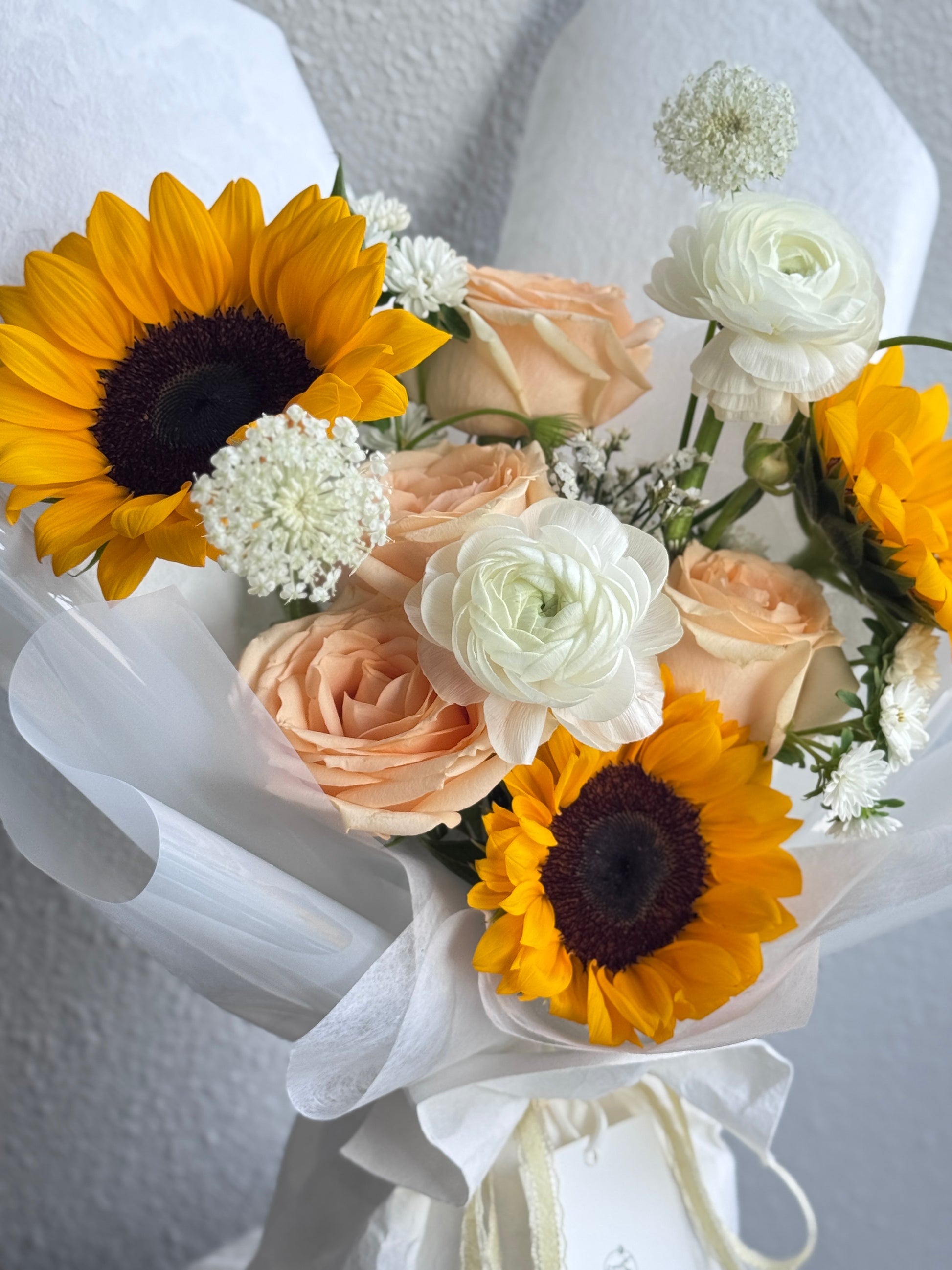 A bright and graceful bouquet featuring sunflowers, champagne roses, ranunculus, daisies, and delicate fillers. The cheerful sunflower radiates warmth, while the champagne rose and ranunculus bring elegance and romance, perfectly balanced with the freshness of daisies.