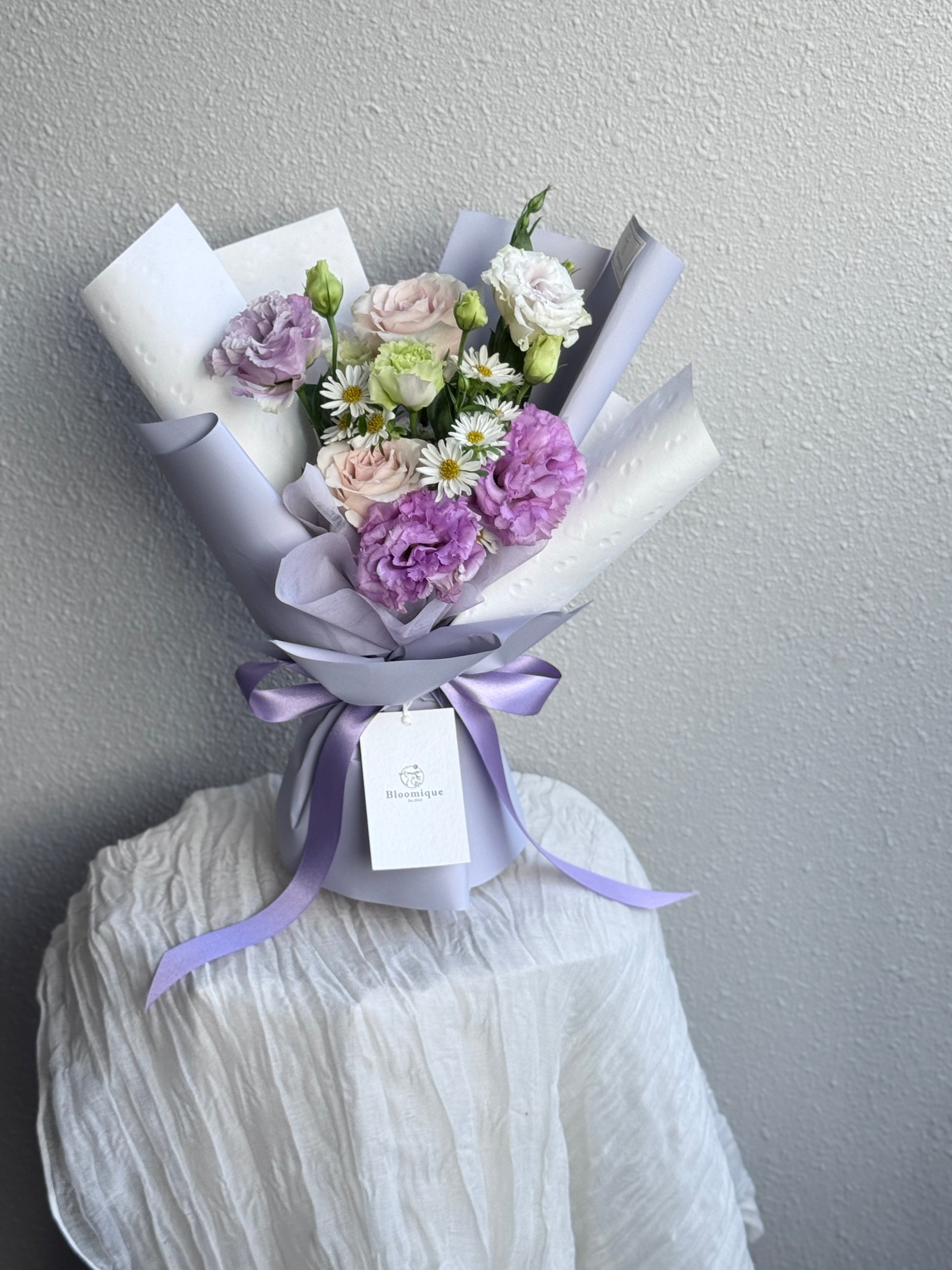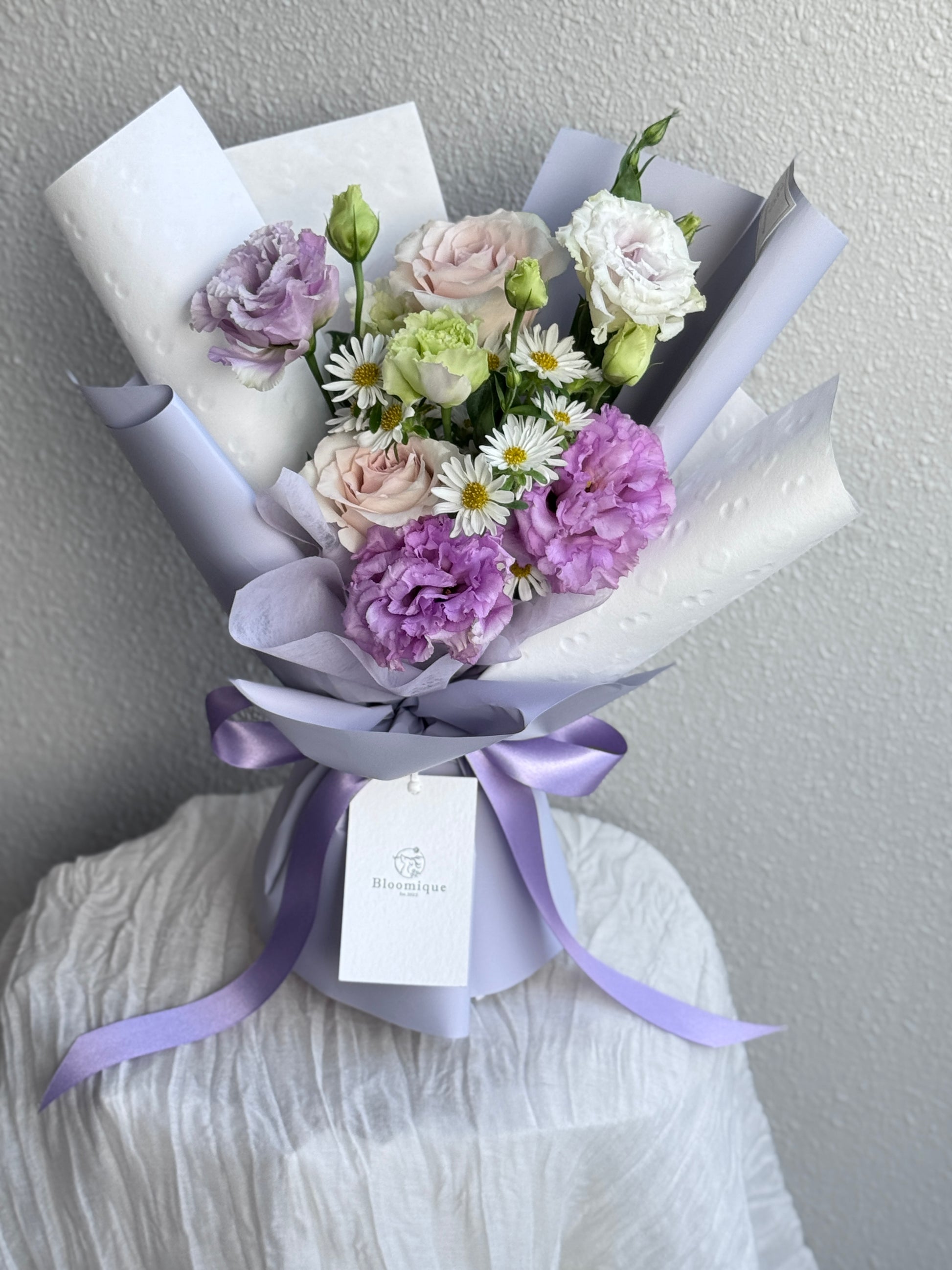 A sweet and romantic bouquet featuring soft pink roses, delicate ice-cream eustoma, and cheerful little daisies. This charming combination creates a dreamy yet refreshing look, perfect for expressing affection, gratitude, or simply brightening someone’s day.